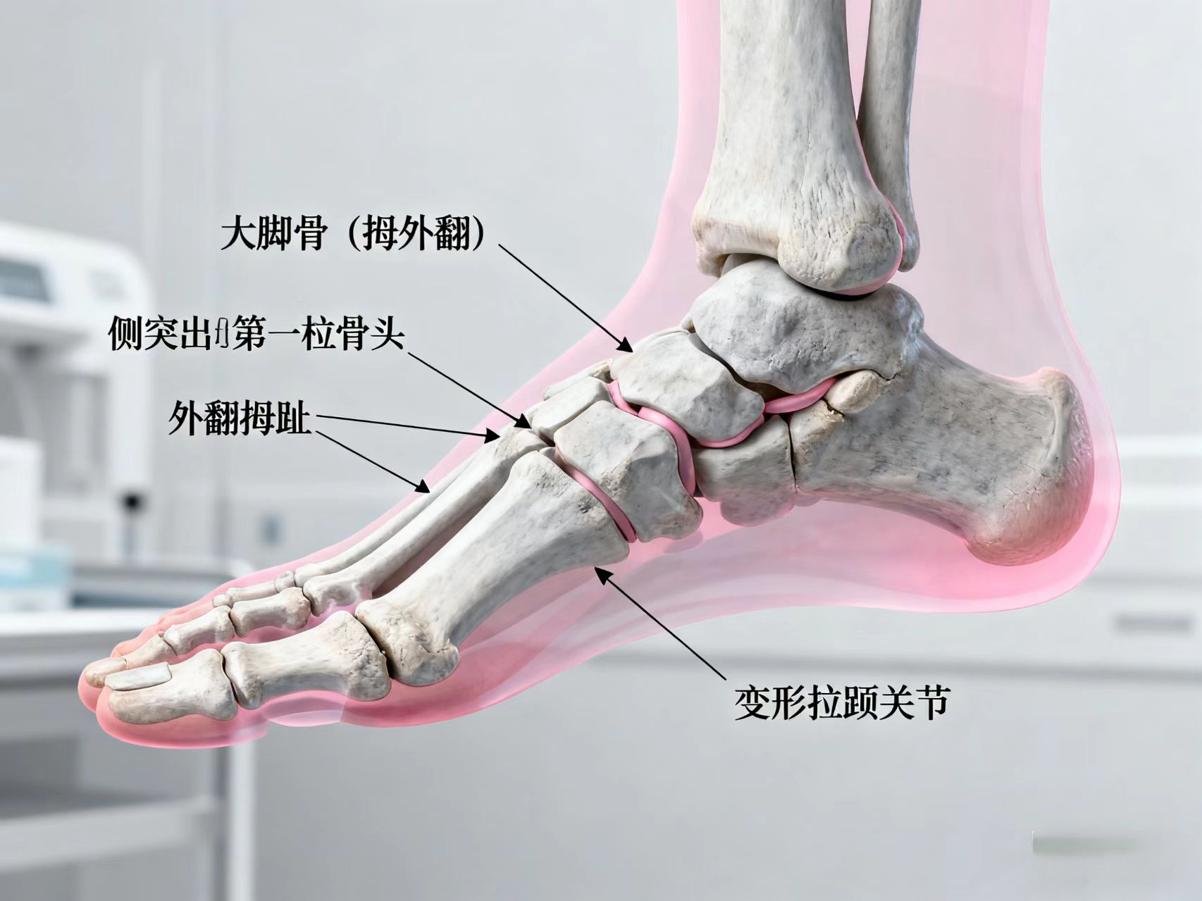 1. 遗传因素(内因):这是最主要的原因。多数患者有家族史,天生就存在足部结构缺陷,如扁平足、第一跖骨过长或过短、关节韧带过于松弛等,这些因素使得足部在承重时不稳定,更容易发生畸形。