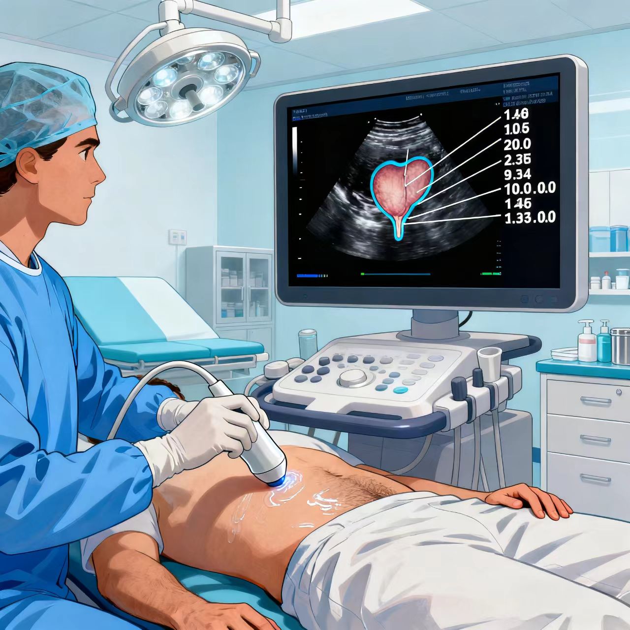 6. B超检查:可以测量前列腺的大小、形态,并检查膀胱内有无残余尿(排尿后膀胱里剩下的尿量)。