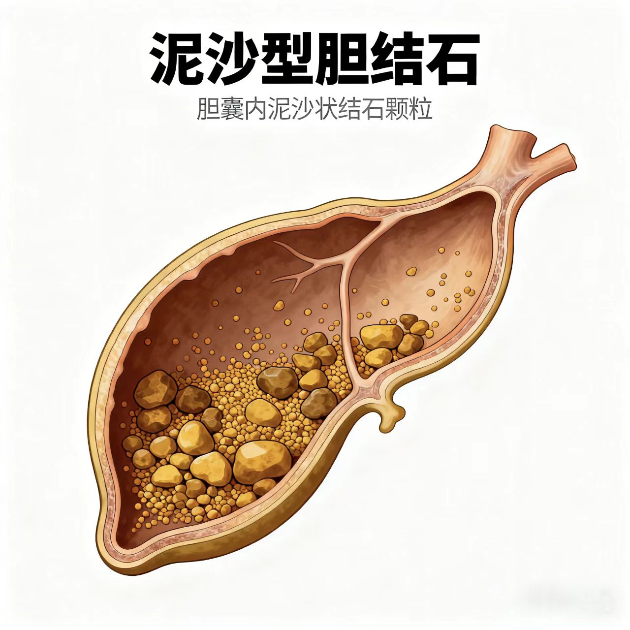 · 泥沙型胆结石:像河底的“细沙”,是无数极其微小的颗粒(通常直径小于2-3毫米)混在胆汁里,可以随胆汁流动。